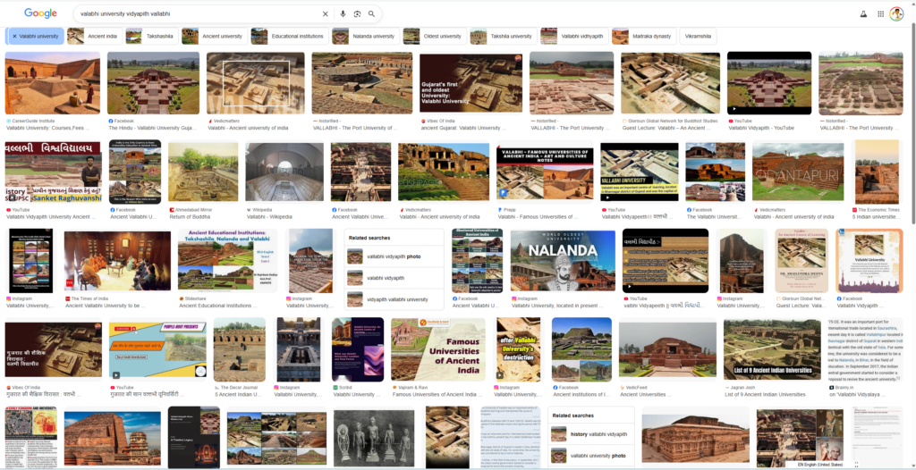 જો Google માં “Valabhi”, “Vallabhi” અથવા “Valabhi University” જેવા શબ્દો શોધવામાં આવે, તો જે તસવીરો દેખાય છે, તેમાંના મોટા ભાગના ફોટા વાસ્તવમાં નાલંદા યુનિવર્સિટી, બૌદ્ધ મઠોના અવશેષો, અન્ય ખોદકામ સ્થળો, પ્રતીકાત્મક ruins અથવા stock photos હોય છે. આથી સ્પષ્ટ થાય છે કે ઇન્ટરનેટ પર પ્રચલિત થયેલા મોટા ભાગના ફોટા વાસ્તવિક વલભીના નથી.